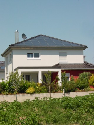 21 qm Solarfläche - optisch perfekt integriert | | Kfw 60 Haus, Lutz Solardach mit individuell angepassten Schrägschnitt, Wärmepumpe und 1000 Liter Pufferspeicher. Im Rahmen des Effizienzbonus wurde die Anlage mit 210 Euro / qm von der Bafa gefördert. |